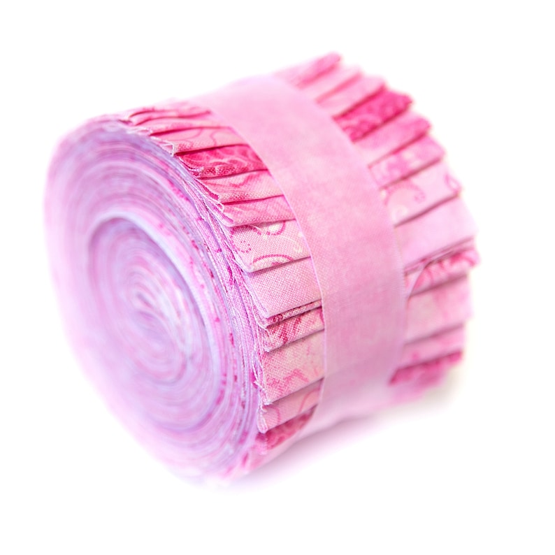Each jelly roll includes 2 strips of each of the 9 designs in various beautiful tone-on-tone Beautiful Pinks shades.