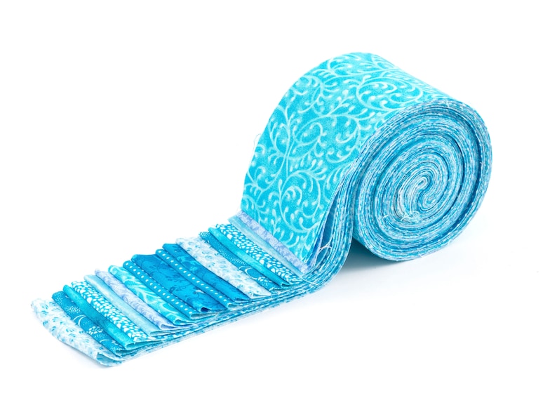 Each jelly roll includes 2 strips of each of the 9 designs in various beautiful tone-on-tone Beautiful Turquoises shades.