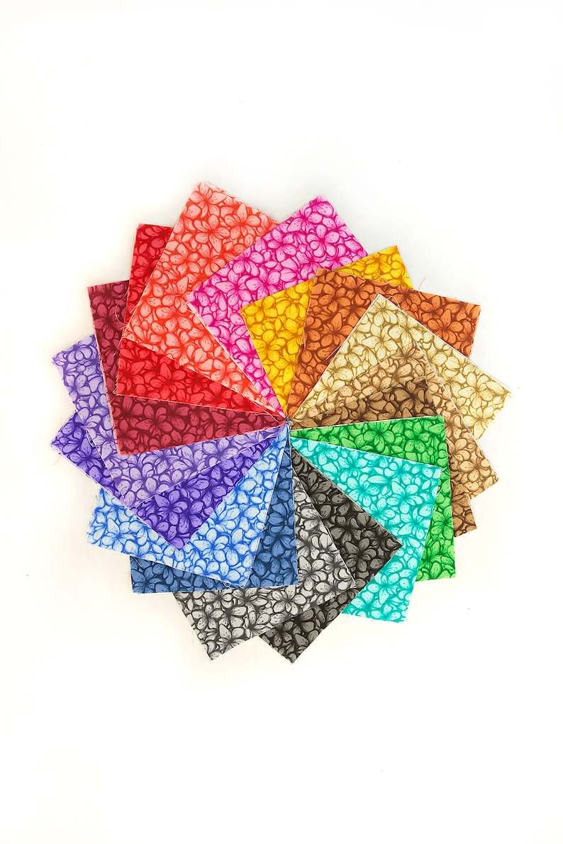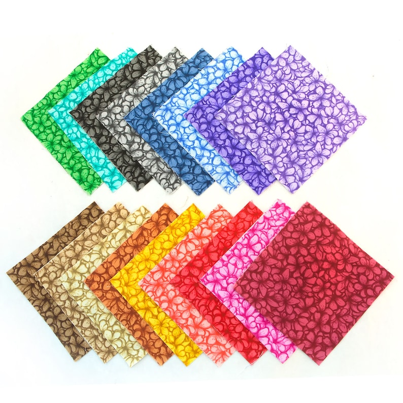 Our Awesome Blossoms 5” Pre-Cut Fabric Charm Pack gives you 102 machine-cut squares in a vibrant range of 17 coordinated floral colors.